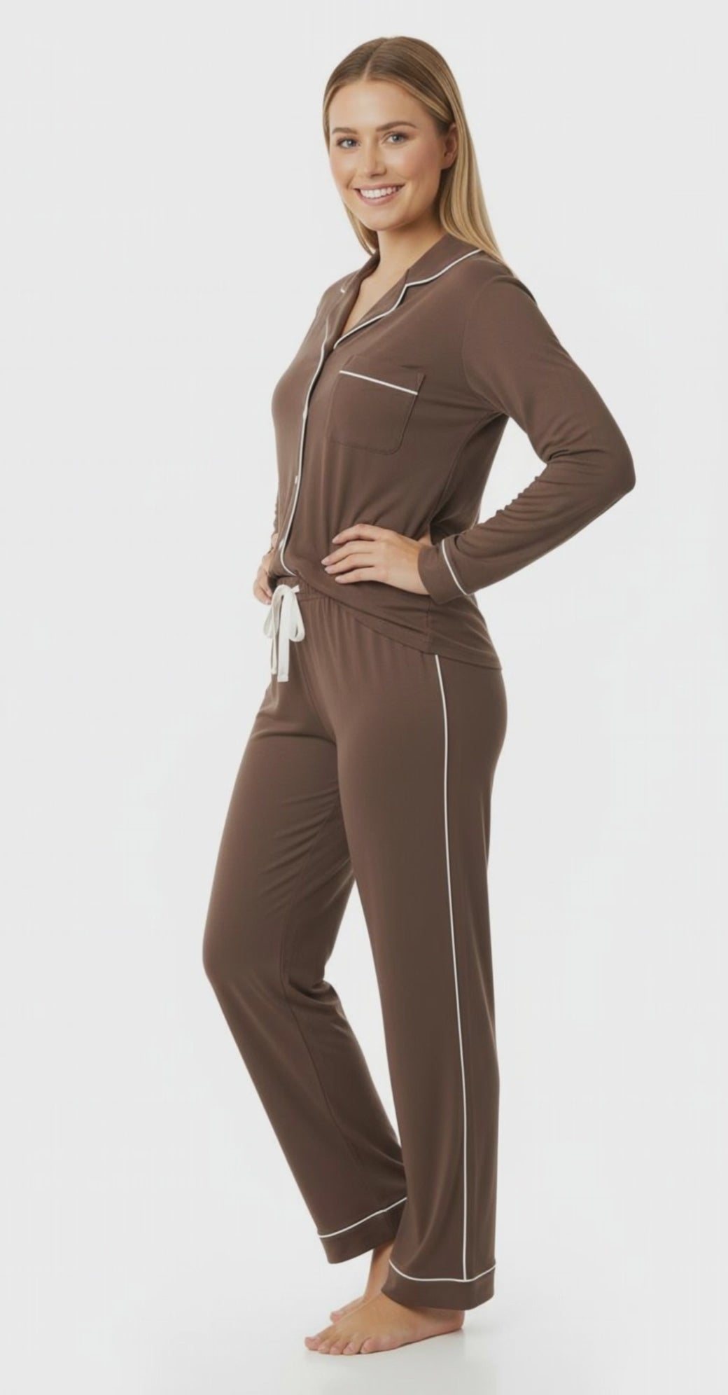 Our pajama set features a classic button-up top with a notched collar, paired with flowing, full-length pants. Elegant piping along the edges adds a touch of refinement to both pieces. Crafted from our signature bamboo-spandex blend, this set offers unparalleled softness and breathability for your ultimate comfort.